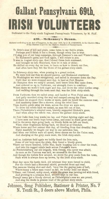 To Erin's sons of hill and plain, come listen to my feeble strain (6 vs.) Air.—McKenney's Dream Dedicated to the Sixty-ninth Regiment Pennsylvania Volunteers, by M. Fay; cop: 1863, J. H. Johnson, EDPa.