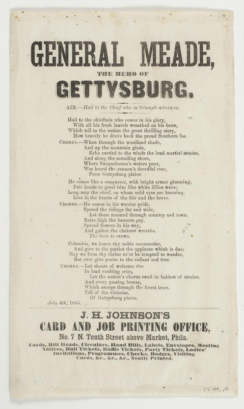Hail to the chieftain who comes in his glory (3 vs. and chors.) Air.—Hail to the Chief who in triumph advances. July 4th, 1865; print. Johnson (2); adv: Cards, Bill- Heads, Circulars, etc. 24.5 x 14.5 cm.