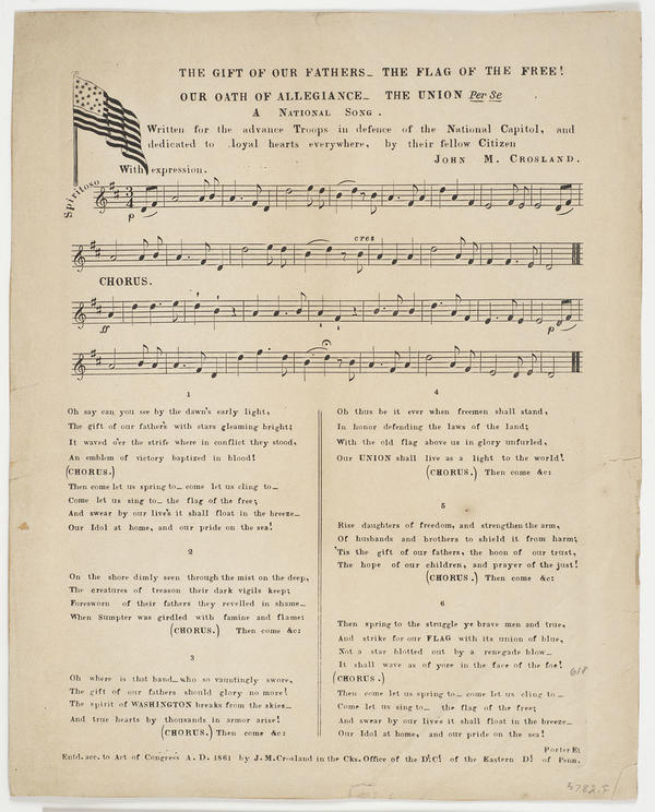 Oh say can you see by the dawn's early light (6 vs. and chor. with music) By John M. Crosland, Written for the advance Troops in defence of the National Capitol, and dedicated to loyal hearts everywhere; cop: 1861, J. M. Crosland, EDPa. Lithographed; flag. 30.3 x 24.2 cm.