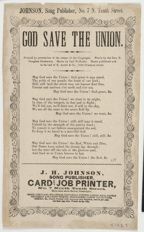 May God save the Union! God grant it may stand (4 vs. and chor.) Printed by permission of the owner of the Copyright; Words by the Rev. Douglass Brewerton; Music by Carl Wolfsohn; music publ. and to be had of G. Andre and Co.; publ. Johnson (2); adv: Cards, Circulars, Bill-Heads, etc. A-J border. 22.5 x 13.5 cm.