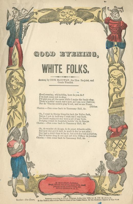 Good evening white folks, how do you do (3 vs. and chor.) As sung by Dick McGowan, the Lion Banjoist, and Comic Vocalist; publ. De Marsan (2). De Marsan clown border, col.; cop: 1860, H. De Mar- san SDN.Y. 26.2 x 16 cm.