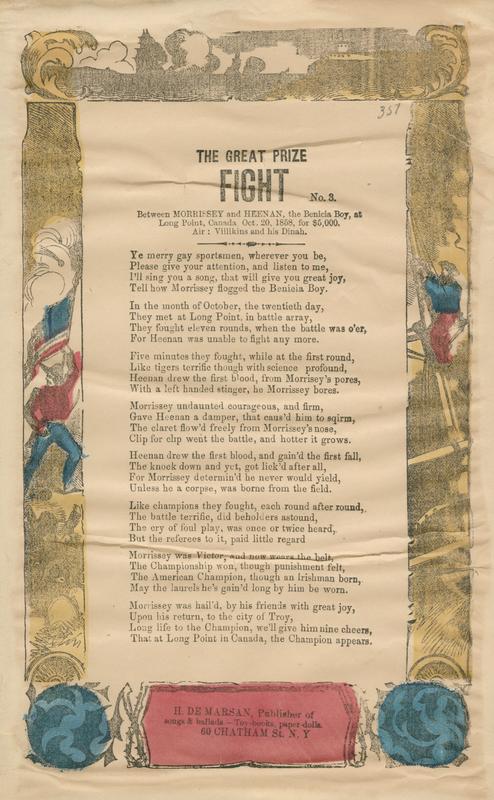 Ye merry gay sportsmen, wherever you be (8 vs.) Air: Villikins and his Dinah. Following title: "Between Morrissey and Heenan, the Benicia Boy, at Long Point, Canada, Oct. 20, 1858, for $5,000;" publ. De Marsan (4). De Marsan ship border, col. 25.5 x 16 cm