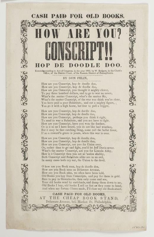 How are you Conscript, hop de doodle doo (4 vs.) By Don Felix; cop: 1863, W. Rodgers, EDPa.; adv: Cash paid for Old Books, at the Cheap Book Stand, Delaware Avenue, bel. Market St. Philadelphia. T. o. border. 24.5 x 15.3 cm.