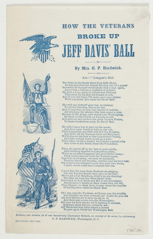 Far down in the South there lives Jeffy Davis (6 vs.) Air—"Lanagan's Ball." By Mrs. G. P. Hardwick; adv: Soldiers can receive 14 of our beautifully illustrated Ballads by addressing G. P. Hardwick; copyright secured. Letter paper; blue ink; eagle, sailor