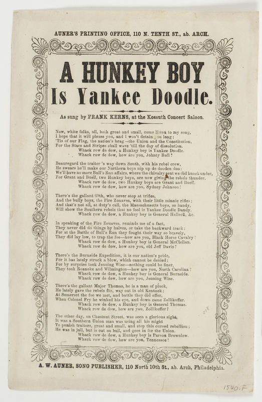 c. Title: "Hunkey Boy is Yankee Doodle, or, Whack Row De Dow"; varying punctuation in first line; as sung by Frank Moran of Carncross and Dixey's Minstrels and Opera Troupe; publ. Johnson (2); adv: Prof. Brooks' Ball Room Monitor. A-J border. 25.2 x 15 cm.
