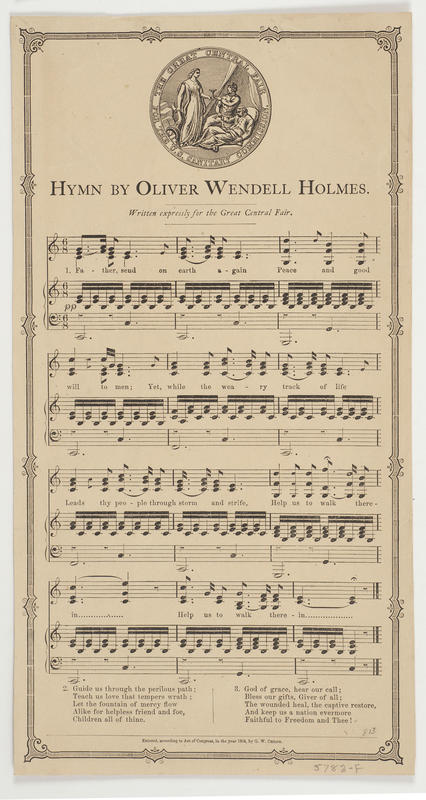 Father, send on earth again (3 vs. with music to 1st vs.) Written expressly for the Great Central Fair; cop: 1864, G. W. Childs. Pink paper; t. o. border; seal of the Great Central Fair for the U.S. Sanitary Commission. 28 x 14.7 cm.