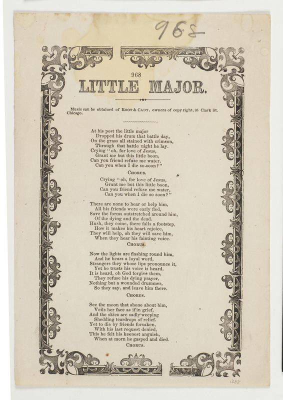 At his post the little major (4 vs. and chor.) Sheet no. 968; Music obtained at Root and Cady (2), owners of the copyright. T. o. border. 21.1 x 14.5 cm.