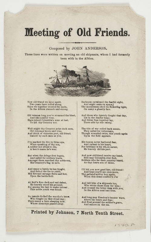 Now old friend we meet again (16 vs.) Composed by John Anderson; with explanation begin- ning: "These lines were written on meeting an old ship- mate . . ."; print. Johnson (2). Steam boat. 19.9 x 12.5 cm.