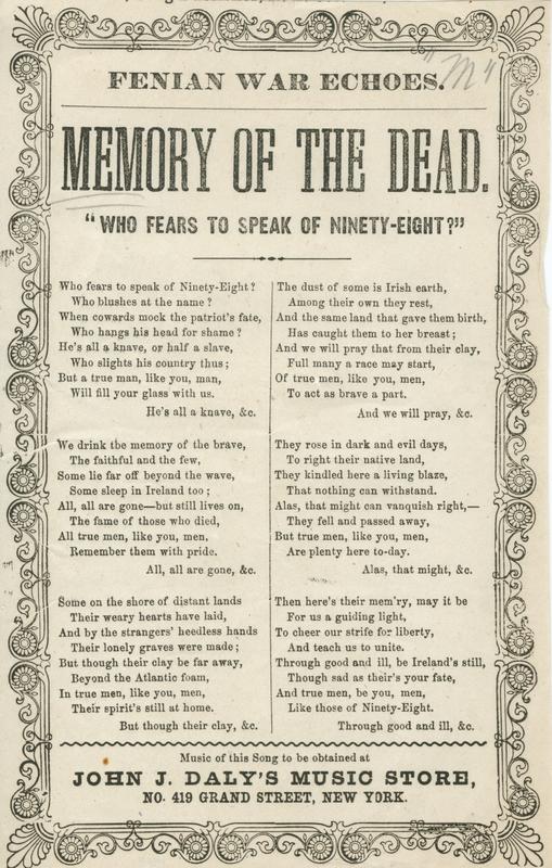 Who fears to speak of Ninety-Eight (6 vs.) Headed: "Fenian War Echoes"; Music obtained of Daly's (2). A-J border. 20.4 x 13 cm. (cropped)