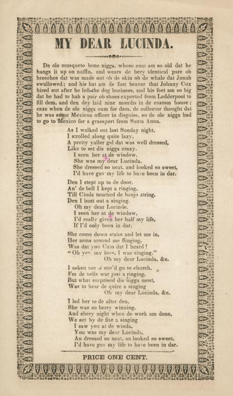 As I walked out last Sunday night (5 vs.) With narrative beginning: "De ole musqueto bone nigga. . ."; Adv: Price One Cent. T. o. border. 23.7 x 13.7 cm.