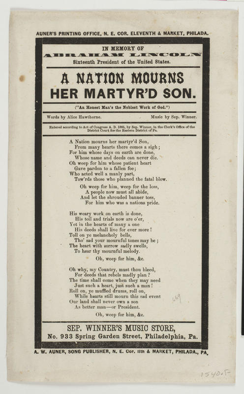 A Na- tion mourns her martyr'd Son (3 vs. and chor.) Headed: "In Memory Of Abraham Lincoln Sixteenth President of the United States"; with quotation: "An Honest Man's the Noblest Work of God"; words by Alice Hawthorne [Septimus Winner]; music by Sep. Winn