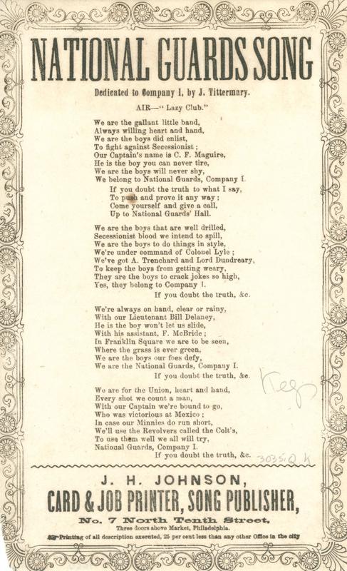 We are the gallant little band (4 vs. and chor.) Air—"Lazy Club." Dedicated to Company I, by J. Tittermary! [publ.] Johnson (2); adv: Printing of all description. A-J border. 19.9 x 12.3 cm. (cropped)