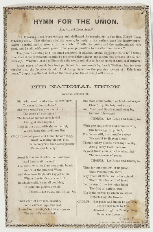Oh! who would strike the recreant blow (5 vs. and 2 chors.) Air, "Auld Lang Syne." Headed: "Hymn For The Union"; by Chas. Collins, Jr.; print. T. Sinex; with explanation of song beginning: The following lines were written and dedicated by permission, to the Hon. Henry Clay, February 1851..." T.o. border. 20.5 x 13.5 cm.