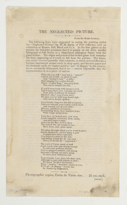 What ails you Jeff? hast had a "'smash?" (7 vs.) From the Home Journal; with explanation of song beginning: "The following lines were suggested on seeing the painting styled the 'Neglected Picture', by W. M. Davis ..."; adv: Photographic copies, Carte de Visite size; [with account of painting from the New York Herald on verso.] 20 x 13 cm.