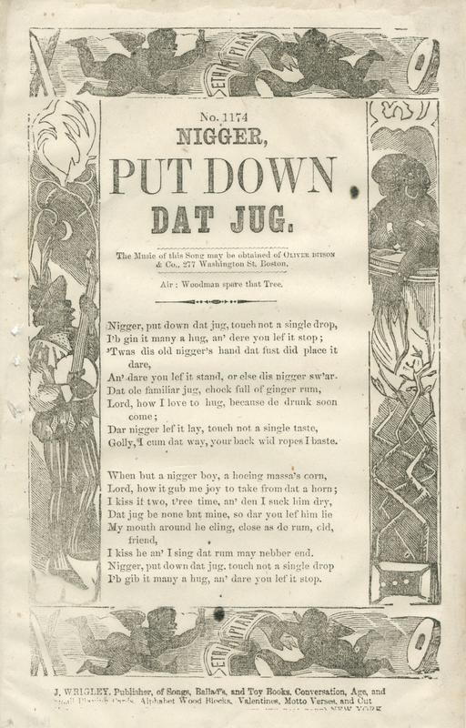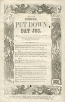 Nigger, put down dot jug, touch not a single drop (2 vs.) Air: Woodman spare that Tree. Music obtained of Oliver Ditson and Co. (1); publ. Wrigley (1). Wrigley Ethiopian border. 24.5 x 15.5 cm.