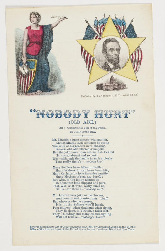 Mr. Lincoln a great speech was making (3 vs.) Air: Columbia The Gem of the Ocean. By John Ross Dix; cop: 1864, Charles Magnus, SDN.Y. Letter paper; blue ink; hdpc. Magnus 8, col; publ. Magnus (1). 20.5 x 12.5 cm.