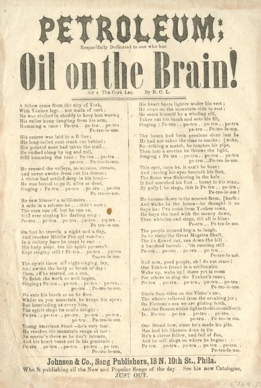A fellow came from the city of York (16 vs.) Air: The Cork Leg. By B. C. L. a. Title: "Petroleum"; Respectfully Dedicated to one who has Oil on the Brain; publ. Johnson and Co.; adv: new Catalogue, Just Out. 22 x 15.5 cm. b. Publ. De Marsan (3). De Marsan c