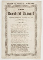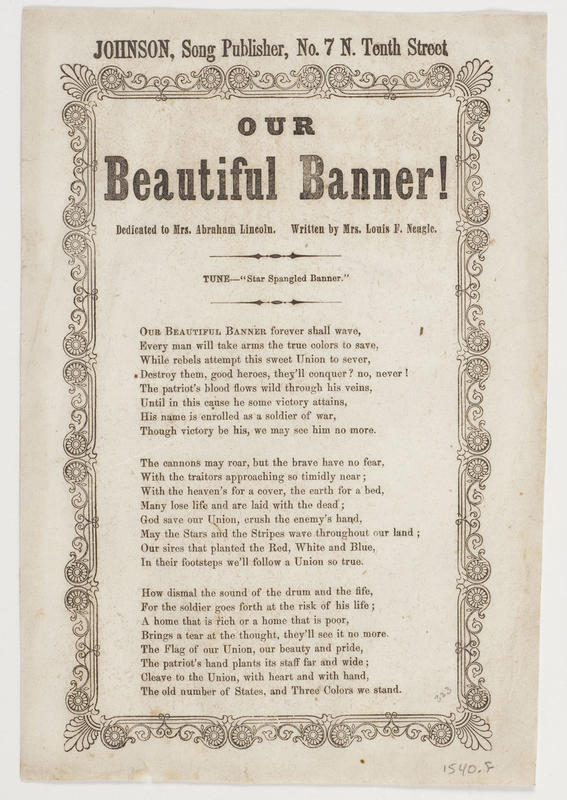 Our Beautiful Banner forever shall wave (3 vs.) Tune—"Star Spangled Banner." Written by Mrs. Louis F. Neagle; dedicated to Mrs. Abraham Lincoln; publ. Johnson (2). A-J border. 22.5 x 15 cm.