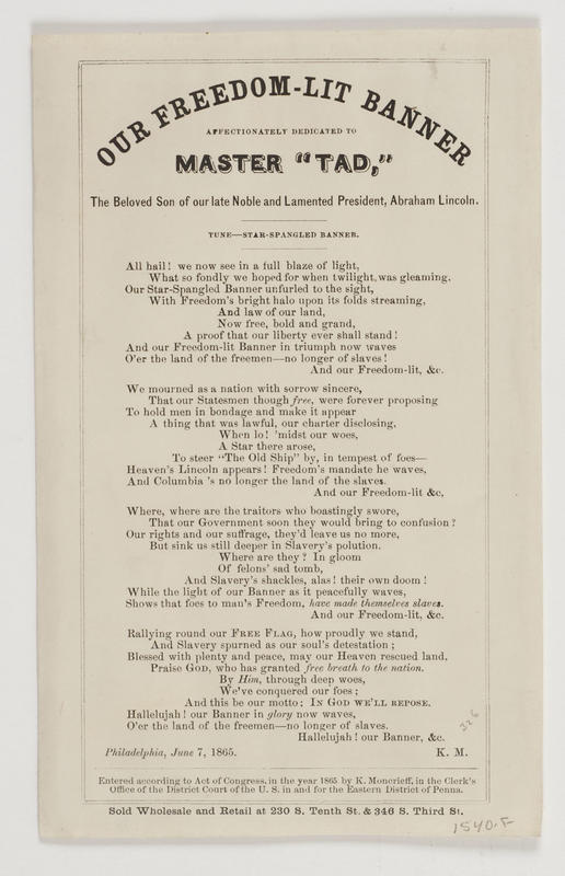 All Hail! we now see in a full blaze of light (4 vs.) Tune—Star-Spangled Banner. Dedicated to Master "Tad," The Beloved Son of our late Noble and Lamented President, Abraham Lincoln; Philadelphia, June 7, 1865; [signed] K. M.; cop: 1865, K. Moncrieff, EDPa; sold at 230 S. Tenth St. & 346 S. Third St. Double-lined border. 19.5 x 12.5 cm.