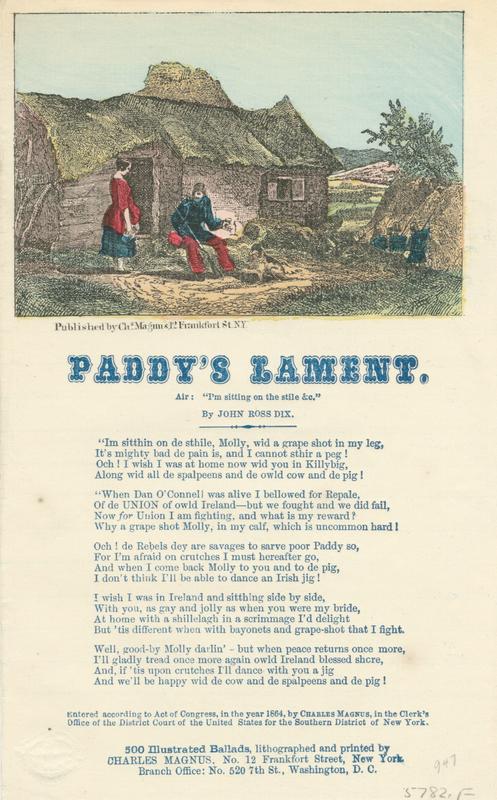 Im sitthin on de sthile, Molly, wid a grape shot in my leg (5 vs.) Air: I'm sitting on the stile and c. By John Ross Dix; cop: 1864, Charles Magnus, SDN.Y.; adv: 500 Illustrated Ballads [publ.] Magnus (2). Letter paper; blue ink; hdpc. Magnus 190, col.; pub
