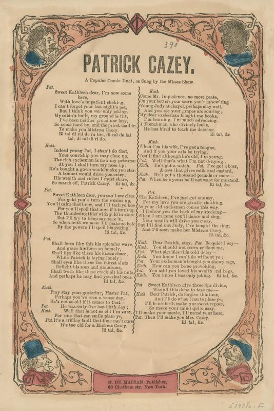 Sweet Kathleen dear, I'm now come here (10 vs.) A Popular Comic Duet, as Sung by the Misses Shaw; publ. De Marsan (4). De Marsan comic heads border, col. 24.4 x 16.2 cm.