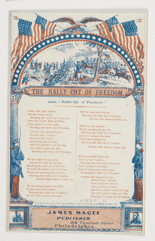 Come true loyal hearts (5 vs. and 2 chors.) Tune—"Battle Cry of Freedom." Publ. Magee; cop: 1864, J. Magee, EDPa. Letter paper; red and blue ink; round arch supported by two columns with a soldier on either side, battle scene at top with flags. 20.2 x 12.