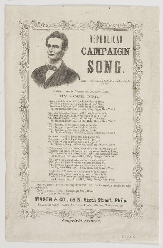 Lincoln and Johnson will guide the ship of State, (7 vs.) Air.—"Ells- worth's body lies mouldering in the dust." Dedicated to the Lincoln and Johnson clubs; by "Our Ned"; adv: Dealers and Clubs can be supplied; [publ.] Mason and Co.; Copyright Secured. A-J
