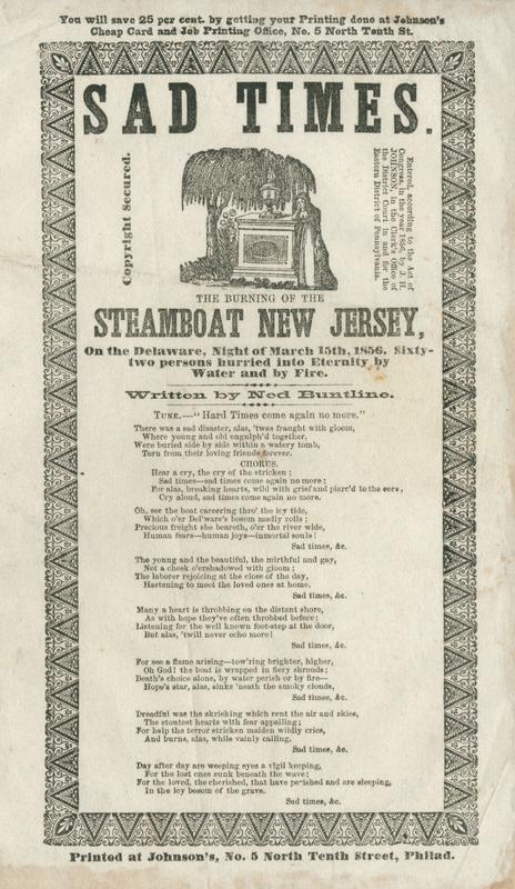 There was a sad disaster, alas, 'twas fraught with gloom (7 vs. and chor.) Tune.: "Hard Times come again no more." Written by Ned Buntline [Edward Zane Carroll Judson]; copyright secured; cop: 1856, J. H. Johnson, EDPa.; adv: You will save 25 per cent. by getting your Printing done at Johnson's; print. Johnson (3). T.o. border; woman leaning by tomb. 23.2 x 15 cm.