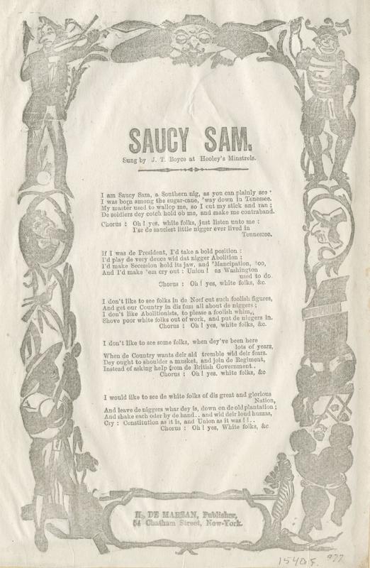 I am Saucy Sam, a Southern nig, as you can plainly see (5 vs. and chor.) Sung by J. T. Boyce at Hooley's Minstrels; publ.