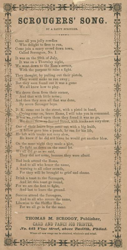Come all you jolly rowdies (10 vs.) By A Saucy Scrouger; publ. Thomas M. Scroggy (2). T. o. border. 22.5 x 12 cm.
