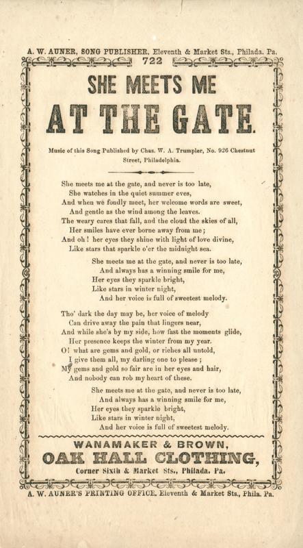 She meets me at the gate, and never is too late (2 vs. and 2 chors.) Sheet no. 722; music publ. by Chas. W. A. Trumpler; adv: Wanamaker and Brown, Oak Hall Clothing; publ. Auner (5). T. o. border. 24.7 x 14 cm.