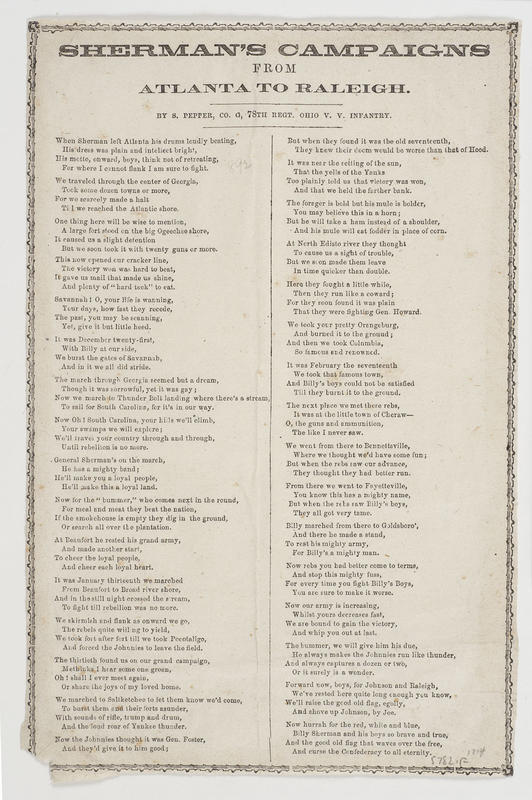 When Sherman left Atlanta his drums loudly beating (31 vs.) By S. Pepper, Co. G, 78th Regt. Ohio V. V. Infantry. T. o. border. 27.4 x 17.6 cm.