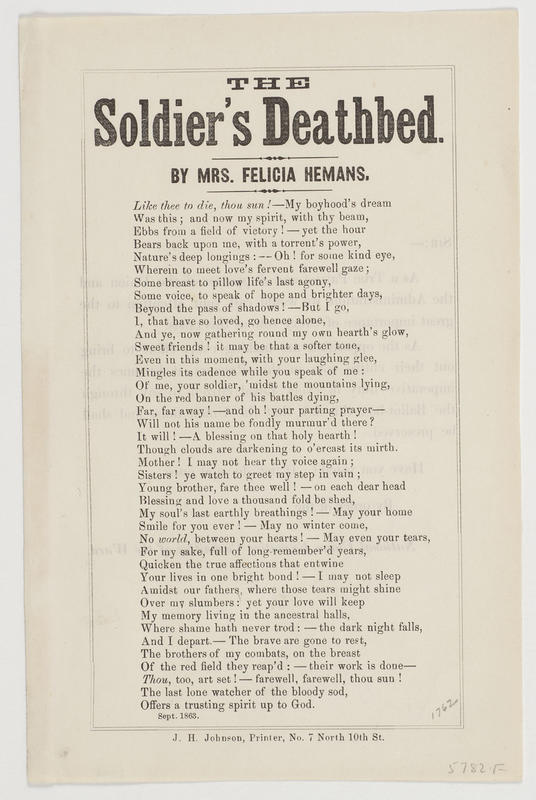 Like thee to die, thou sun! - My boyhood's dream (40 lines) By Mrs. Felicia Hemans; Sept. 1863; print. Johnson (2); [with letter calling for votes from National Union Executive Committee of the Ward on verso.] Double-line border. 20.2 x 13.3 cm.