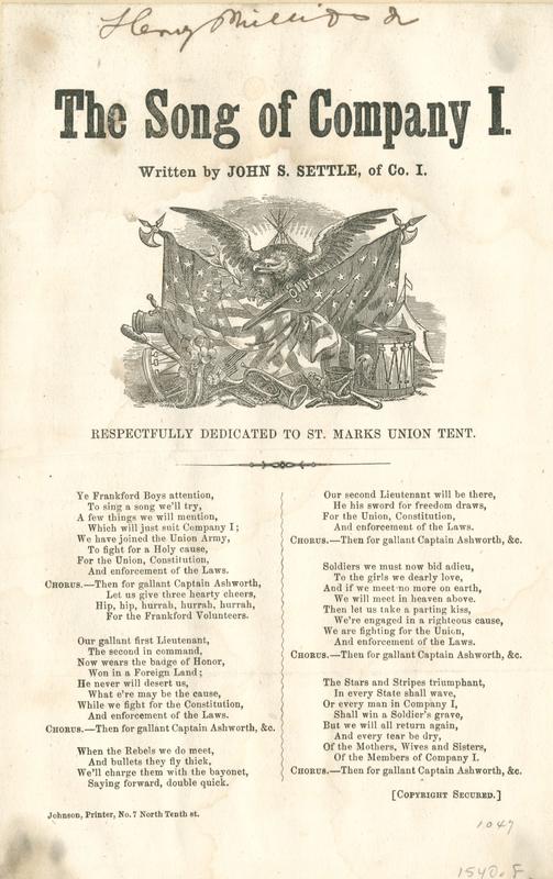 Ye Frankford Boys attention (5 vs. and chor.) Written by John S. Settle, of Co. I; respectfully ded- icated to St. Marks Union Tent; print. Johnson (2); Copyright Secured. Eagle with flags and musical instruments. 23.3 x 14.8 cm.