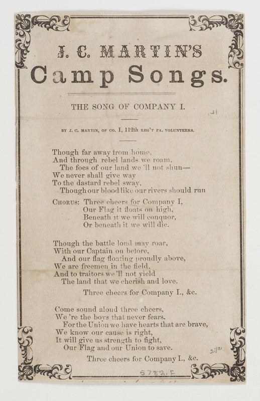 Though far away from home (3 vs. and chor.) Headed: "J. C. Martin's Camp Songs"; by J. C. Martin, of Co. I, 112th Reg't Pa. Volunteers. Double-line border with ornamental corners. 17.8 x 11.1 cm. (cropped)