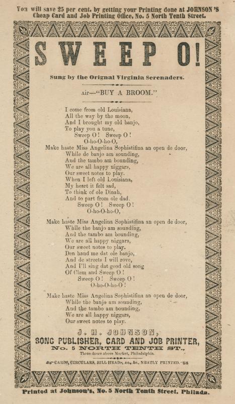 I come from old Louisiana (4 vs. un- even length) Air—"Buy a Broom." Sung by the Original Virginia Serenaders; advs: you will save 25 per cent, by getting your Printing done, and Cards, Circulars, Bill Heads, etc.; publ. Johnson (3). T. o. border. 23.5 x