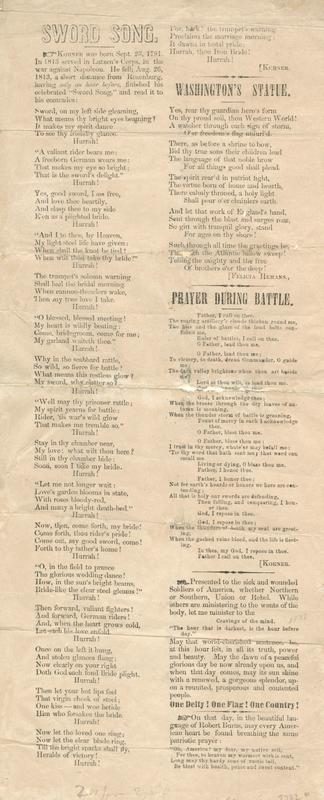 2nd song: "Washington's Statue"; 3rd song: "Prayer During Battle"; with 2 notes at end of songs: "Presented to the sick and