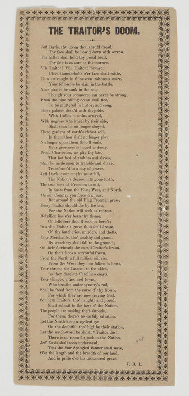 Jeff Davis, thy doom thou should dread (14 vs.) [Signed] J. B. L. Double t. o. border. 28.2 x 13.5 cm.