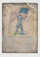Our Volunteers—a noble band (3 vs.) Heavy glazed paper; blue ink; Union soldier with flag, trampling on Confederate flag, col. 11.2 x 8 cm.
