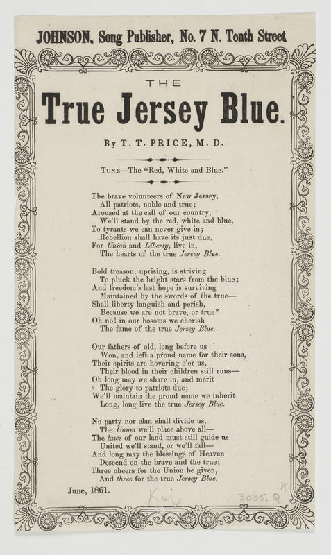 The brave volunteers of New Jersey (4 vs.) Tune—The "Red, White and Blue." By T. T. Price, M. D.; June, 1861; publ. Johnson (2). A-J border. 21 x 12.5 cm.