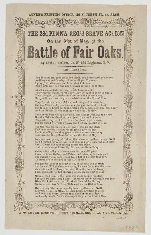 d. Title: "Fair Oaks Battle, Fought on the 31st of May 1862"; respectfully dedicated to the Gallant 23d Pa. Regt. Commanded by Col. Neill; [publ.] Johnson (2). 24.2 x 12.2 cm.
