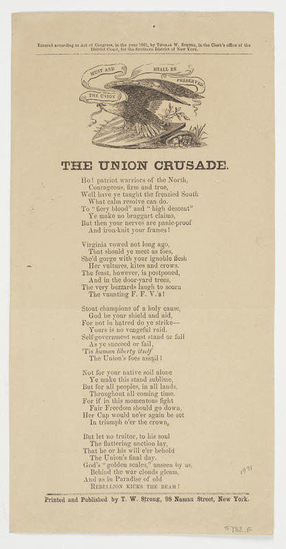 Ho! patriot warriors of the North (5 vs.) Cop: 1861, Thomas W. Strong, SDN.Y.; publ. Strong. Eagle on shield, motto "The Union must and shall be preserved". 26.3 x 13.4 cm.