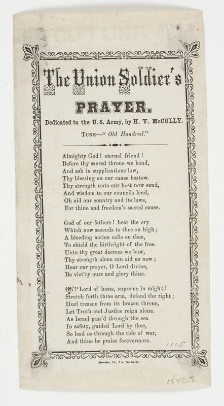 Almighty God! eternal friend (3 vs.) Tune:"Old Hundred." Dedicated to the U. S. Army, by H. V. McCully; print. Johnson (2). T. o. border. 20.3 x 10.5 cm.