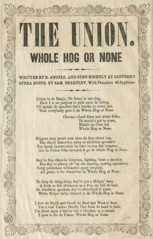 Listen to de Banjo, Oh listen to me sing (5 vs. and chor.) Written by H. Angelo, and sung nightly at Sanford's Opera House, by Sam. Sharpley, With Thunders of Applause. A-J border. 21.4 x 13.7 cm.