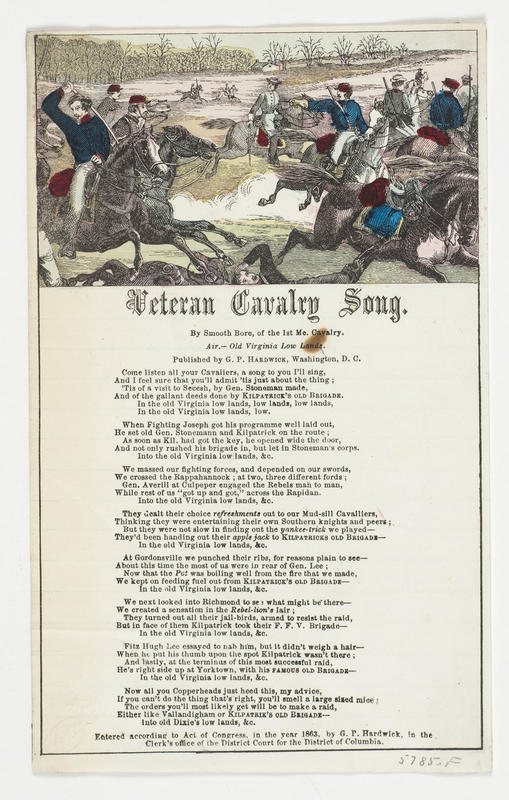 Come listen all your Cavaliers, a song to you I'll sing (8 vs. and chor.) Air.— Old Virginia Low Lands. By Smooth Bore, of the 1st Me. Cavalry; publ. Hard- wick; cop: 1863, G. P. Hardwick, D.C. Letter paper; single-line border; hdpc. Magnus 105, col. 20.5