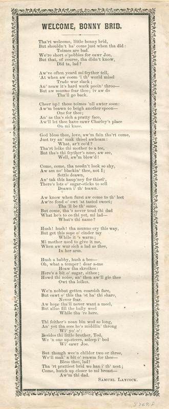 Tha'rt welcome little bonny brid (11 vs.) [Signed] Samuel Laycock. T. o. border. 25.8 x 11.2 cm.
