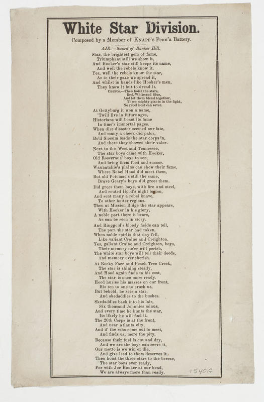 Star, the brightest gem of fame (8 vs. and chor.) Air.—Sword of Bunker Hill. Composed by a Member of Knapp's Penn'a Battery. Double-line border. 23 x 14.5 cm.