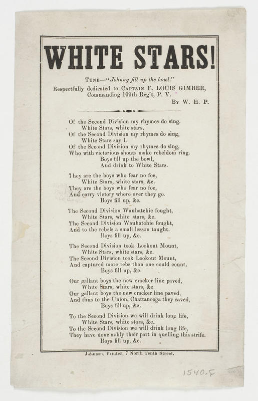 Of the Second Division my rhymes do sing (6 vs. and chor.) Tune—"Johnny fill up the bowl." Respectfully dedicated to Captain F. Louis Gimber, Commanding 109th Reg't, P.V. By W.H.P.; print. Johnson (2). Double-line border. 20.5 x 12.7 cm.