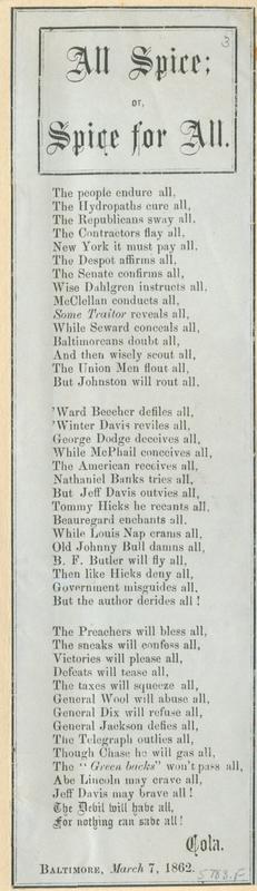 c. Title: "Our Opinion; A Hit At These Times;" with four added verses; [signed] "Le Diable Baiteux," [N. G. Ridgeley,] Baltimore, April 1, 1862. Double-line border; man pasting up sign with title. 28 x 5.8 cm.