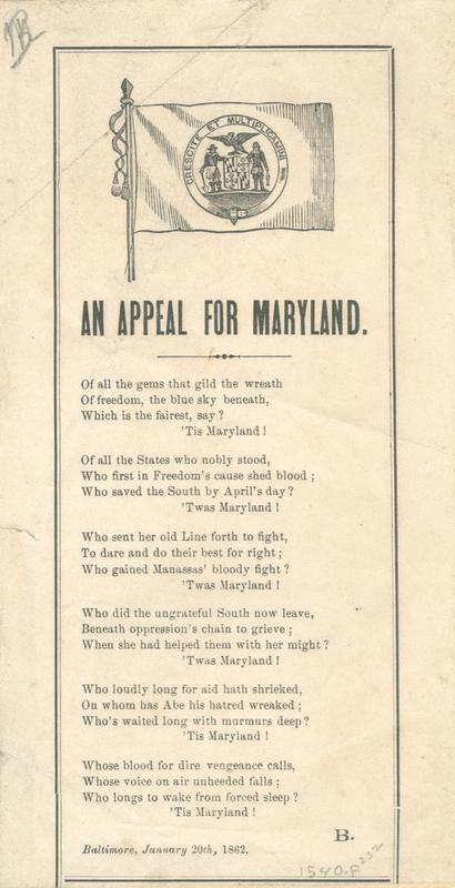 Of all the gems that gild the wreath (6 vs.) [Signed] B; Baltimore, January 20th, 1862. Double-line border; [Bonsai] flag of Maryland. 19 x 10 cm.
